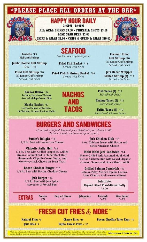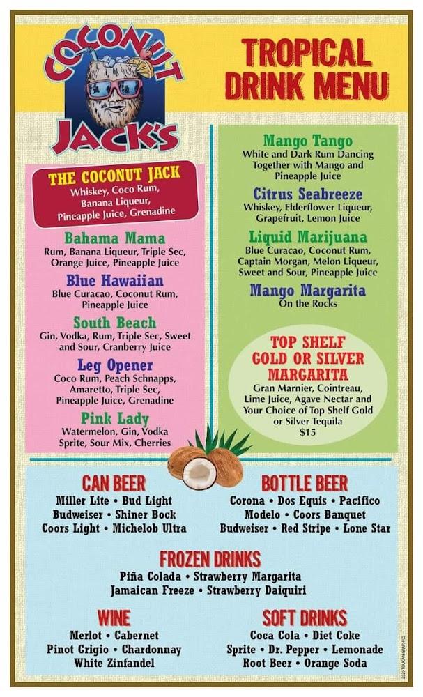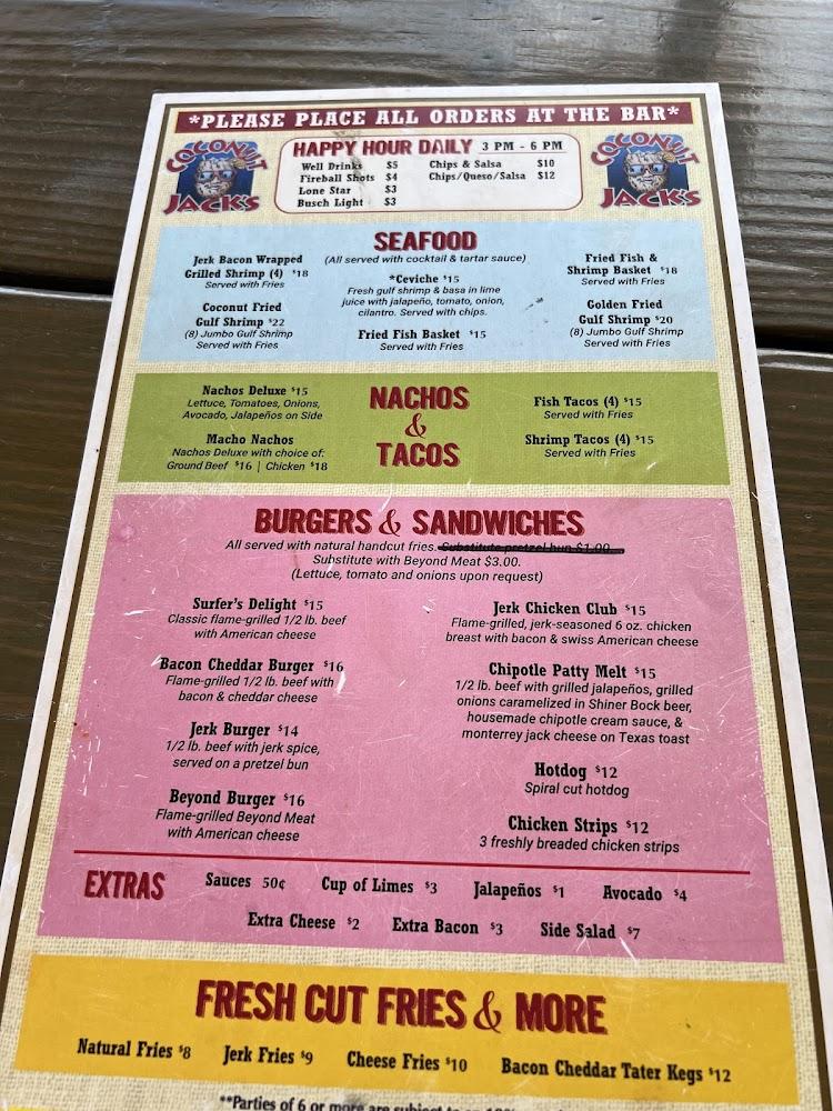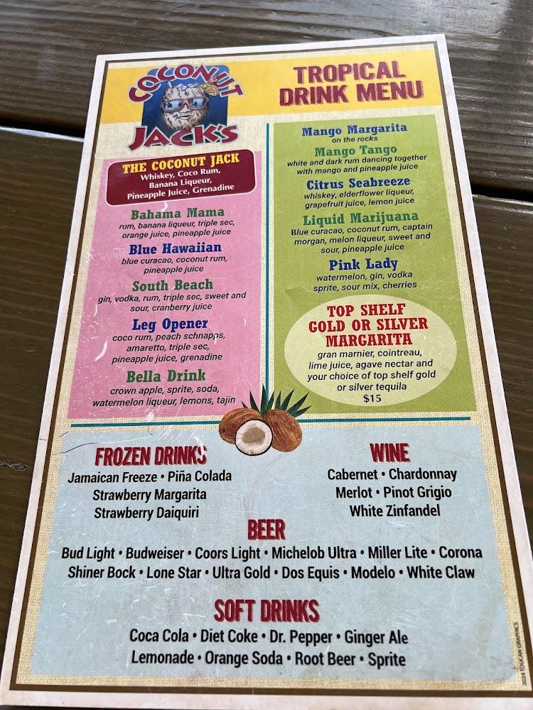 Coconut Jack's menu celebrates local flavors with a variety of seafood and classic dishes. Popular offerings include fried Gulf shrimp and fish tacos. The seafood is always fresh, and most dishes reflect regional ingredients. Many enjoy the Coconut Jack drink, a perfect match for the sunny setting. Happy hour specials feature discounted appetizers and cocktails, encouraging guests to try more. There are options for those who prefer lighter fare, such as salads and small plates. The burger selection also catches attention, especially the Jerk Bacon Burger. With options catering to different tastes, the menu guarantees something for everyone. Casual dining at its finest, each meal feels special.